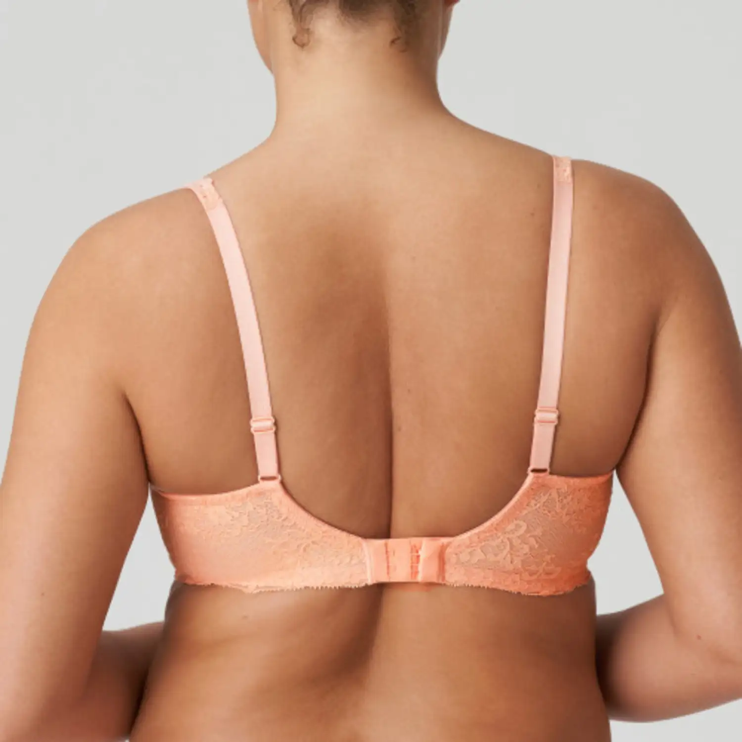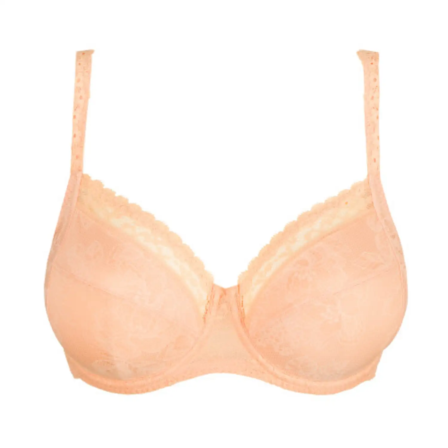Retro beugelbh met volle cups in glanzende stof met een matte kantprint. Vintagekant aan de bovencups accentueert je decolleté en loopt elegant door in de bandjes. Ook het middenvoor en de rug zijn gemaakt van kant. Silky Dreams is een dromerige abrikoostint met een vintage kantprint. Subtiel glanzend en onzichtbaar onder wit.