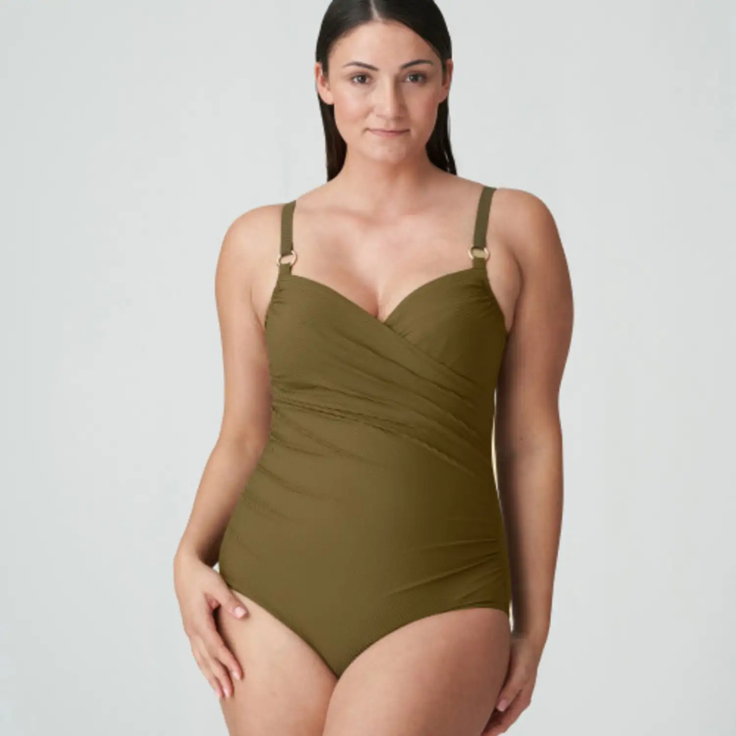 badpak PrimaDonna Swim Sahara. Elegant shaping badpak van lijntjesstof met een flatterende retrosnit. Vooraan is de stof elegant gedrapeerd, gouden ringen aan de bandjes maken je look compleet. Olijf is een warme kakitint met een chique gouden ondertoon. Een flatterende essential met een trendy touch.