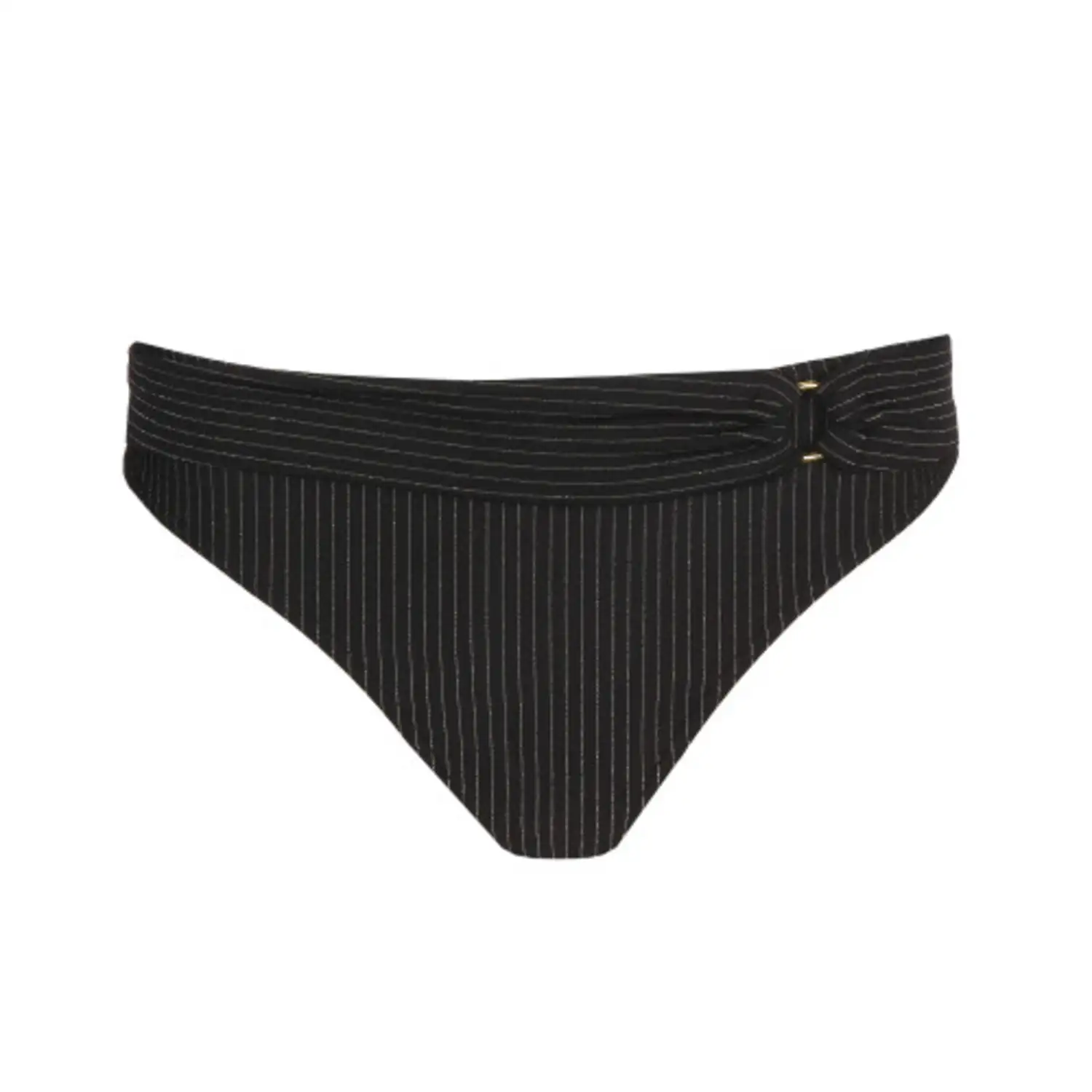 [sk_markdown]Fashionable bikini rioslip in badstof met ingebreide glitterstrepen. De drapage met gouden ring creƫert een elegante taille. Tijdloos zwart met een gouden glans die het zonlicht vangt. Chic en gesofisticeerd![/sk_markdown]