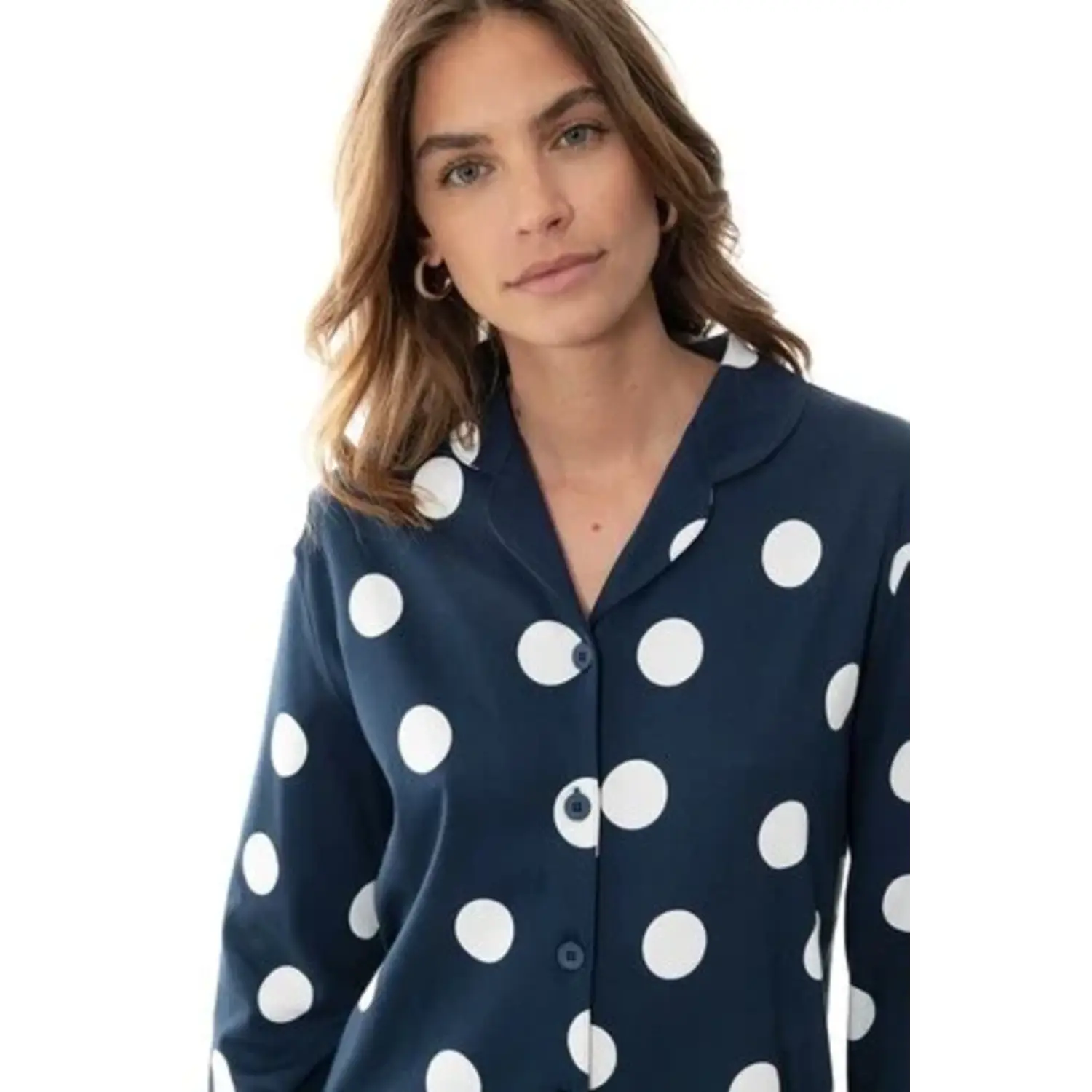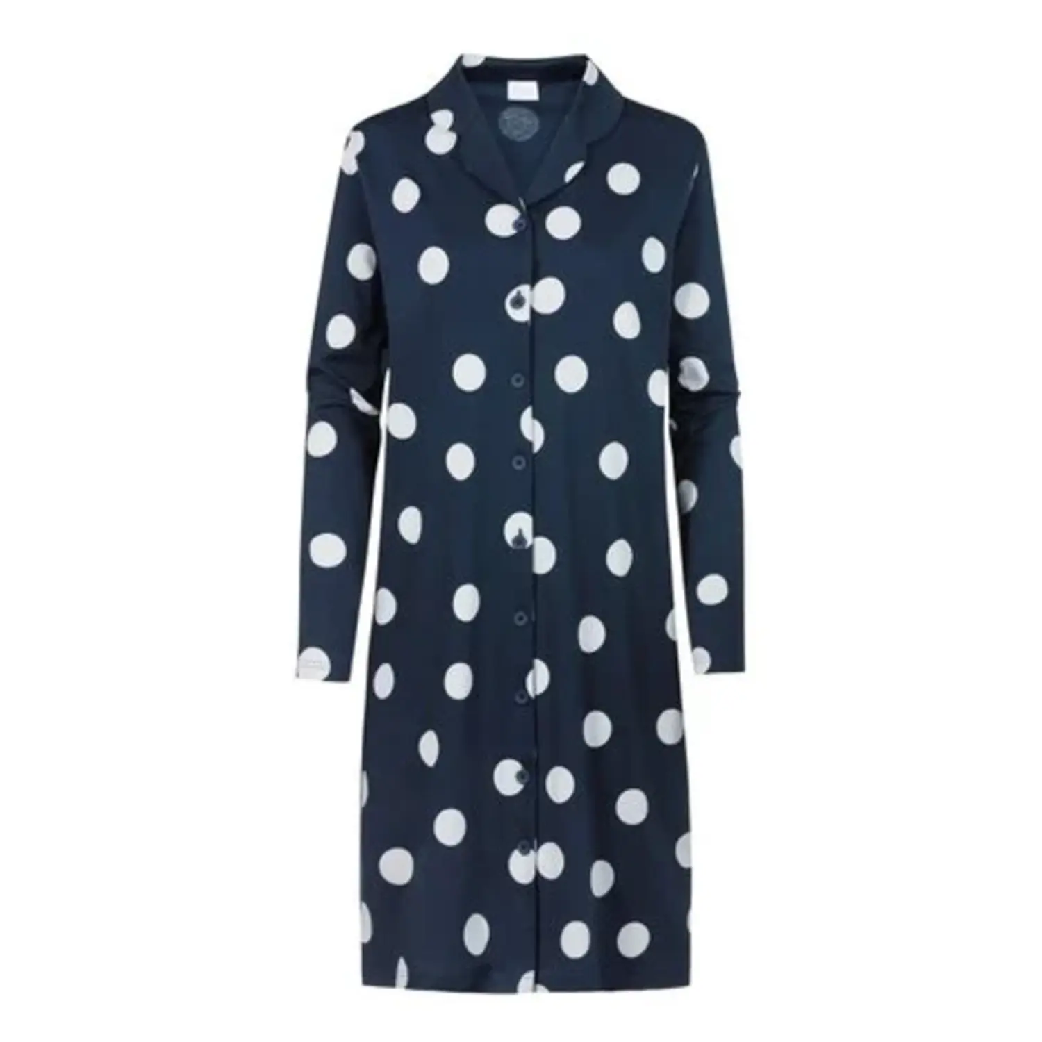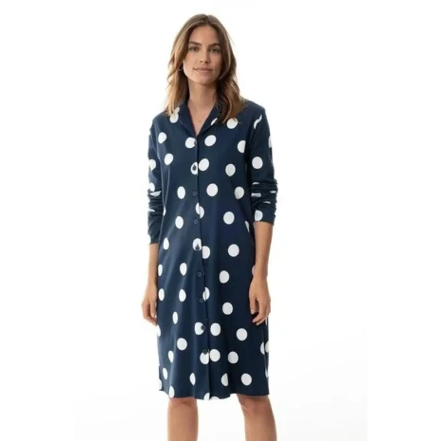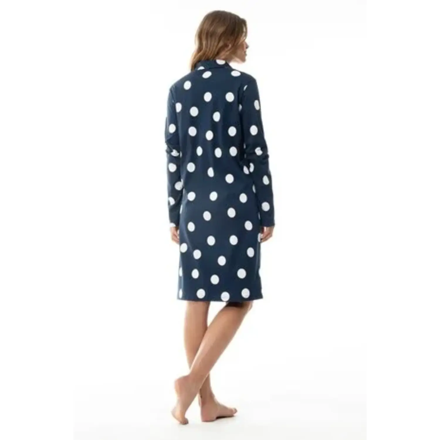 [sk_markdown]Een klassiek nachthemd met moderne polkadot print. Mey Night dames nachthemd met kraag en functionele knopen in donkerblauw. Dit slaapshirt Anouk heeft een casual pasvorm, kraag en knopenrij. De lengte van maat 38 is ongeveer 94 cm, tot boven de knie. Gemaakt van zachte katoen voor een natuurlijk draaggevoel. Ook verkrijgbaar als pyjama met dezelfde print. [/sk_markdown]